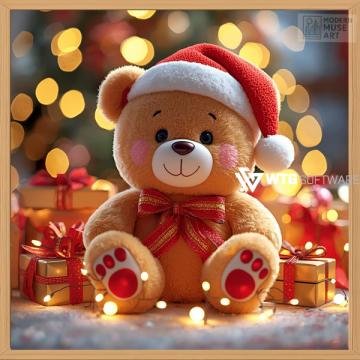 This charming Christmas wall art features a smiling teddy bear wearing a Santa hat and red ribbon bow, surrounded by glowing lights and beautifully wrapped presents. The warm festive tones and bokeh lighting create a cozy, magical holiday atmosphere — perfect for nurseries, kids’ rooms, or Christmas home décor. Instantly download and print this delightful artwork to fill your space with Christmas cheer and timeless joy
