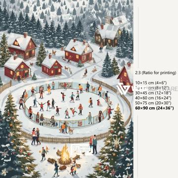 This charming winter village artwork captures a magical Christmas atmosphere filled with warmth, joy, and community. A glowing ice-skating rink surrounded by snowy pine trees, cozy wooden cabins, festive lights, and a crackling bonfire creates a heartwarming holiday scene that instantly transforms any room. Every detail—from families skating together to the gentle snowfall and warmly lit windows—brings nostalgic Christmas spirit to life, making this illustration perfect for seasonal home décor.