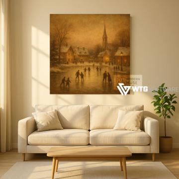 With its warm color palette and nostalgic atmosphere, this print is perfect for enhancing living rooms, holiday mantels, entryway winter displays, dining room décor, family gathering spaces, seasonal gallery walls, rustic cabin interiors, and cozy Christmas homes. The glowing lights and joyful skating scene create a peaceful, heartwarming mood that instantly fills any space with holiday spirit.