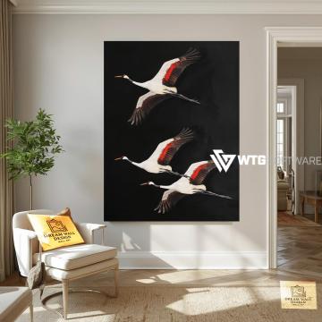 Bring a sense of elegance, harmony, and quiet strength to your home with this stunning digital artwork featuring three red-crowned cranes gliding gracefully across a deep black background. Inspired by traditional Japanese aesthetics, this minimalist composition highlights the cranes’ symbolic meaning—prosperity, longevity, and peace—while adding a bold, modern statement to any room. Perfect for living rooms, entryways, offices, or zen-inspired interiors, this high-resolution artwork transforms your wall with refined simplicity.