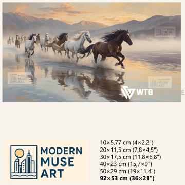 Capture the spirit of pure freedom with this Galloping Horses Freedom Art, featuring a powerful herd running fearlessly across shimmering shallow waters. The artwork blends the elegance of white and brown horses with the serene beauty of mist-covered mountains and a warm pastel sunrise. Their reflections in the water enhance the sense of motion, energy, and natural grace—making this piece a breathtaking centerpiece for homes, offices, cafés, restaurants, boutique hotels, studios, and modern bars.