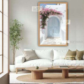 Our Greek Blue Door Print blends charming pink flowers with timeless Mediterranean home décor, creating a warm and uplifting atmosphere inspired by the beauty of Greek island architecture. This artwork features elements of Aegean style, Mediterranean floral photography, coastal blue tones, bougainvillea accents, whitewashed walls, rustic island pathways, traditional doorway art, vibrant floral décor, European coastal charm, island village prints, and heritage-inspired artwork, delivering a serene and inviting aesthetic for any interior.