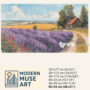 Bring the peaceful charm of the countryside into your space with this Lavender Field Country Cottage Art, featuring sweeping lavender rows, golden wheat fields, and a rustic wooden cottage under a bright summer sky. The artwork captures the warmth of rural life, blending soft purples, warm yellows, and gentle greens in a beautifully textured, painterly style. Its serene atmosphere makes it perfect for creating a calming and welcoming mood in homes, living rooms, bedrooms, kitchens, offices, cafés, boutique shops, restaurants, and hotels.