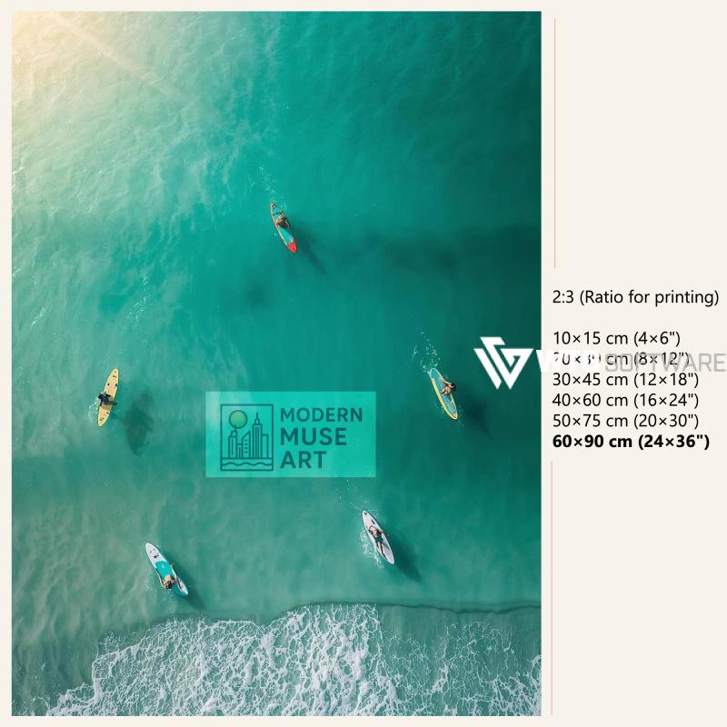 Immerse your space in pure summer energy with this stunning Turquoise Ocean Paddleboard Art Print, captured from an aerial perspective that highlights crystal-clear waves, glowing sunlight, and the peaceful movement of paddleboarders drifting across the sea. The vibrant turquoise tones and soft foamy shoreline create a refreshing, calming atmosphere—perfect for anyone who loves beach life, ocean adventures, and modern coastal decor.