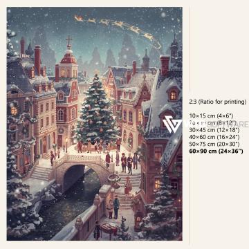 Every detail is crafted with care, from the cobblestone bridge and snowy rooftops to the glowing lanterns and animated characters enjoying the season. This piece beautifully expresses festive winter ambiance, cozy Christmas spirit, magical holiday town, and warm nostalgic charm, making it ideal for seasonal home décor, gift giving, or creating a holiday-inspired gallery wall. The illustration reflects themes of old-fashioned Christmas scenes, storybook holiday imagery, romantic winter village art, and traditional festive joy, transforming any room into a charming seasonal retreat.