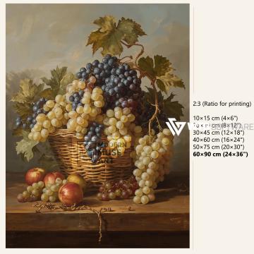 The detailed brushwork, realistic textures, and harmonious color palette evoke a sense of abundance and natural elegance. Whether you're decorating a modern space with a touch of old-world charm or enhancing a classical home aesthetic, this artwork adds depth, warmth, and sophistication. It’s especially ideal for lovers of antique paintings, vineyard decor, fruit artwork, and cozy home atmospheres.