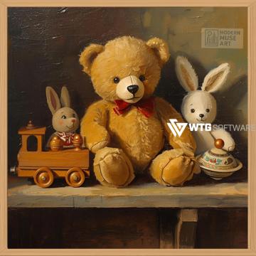 This downloadable vintage toy still life wall art features a charming teddy bear with a red bow tie, two adorable bunnies, a wooden toy train, and a spinning top — painted in a realistic classic style. Perfect for nursery or kids’ room décor, it captures timeless warmth and nostalgic beauty. The rich textures and cozy tones make it a perfect addition to vintage-inspired interiors. Instantly download, print, and frame this high-quality artwork for a heartfelt home touch