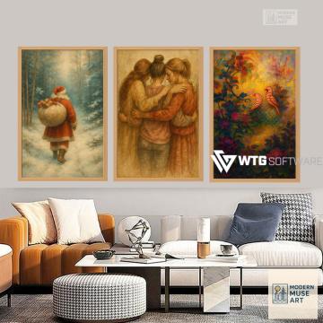 Transform your living space with this elegant wall art set of three vintage-inspired paintings. The collection features heartwarming scenes: a nostalgic Santa Claus walking through a snowy forest, three women sharing a moment of warmth and unity, and two colorful birds surrounded by vivid floral patterns. Together, they evoke feelings of love, kindness, and timeless beauty. Perfect for Christmas or year-round decor, this digital download set blends classic artistry with modern design — ideal for living rooms, hallways, or cozy reading corners. Bring emotional depth and old-world charm into your home instantly with this beautiful triptych